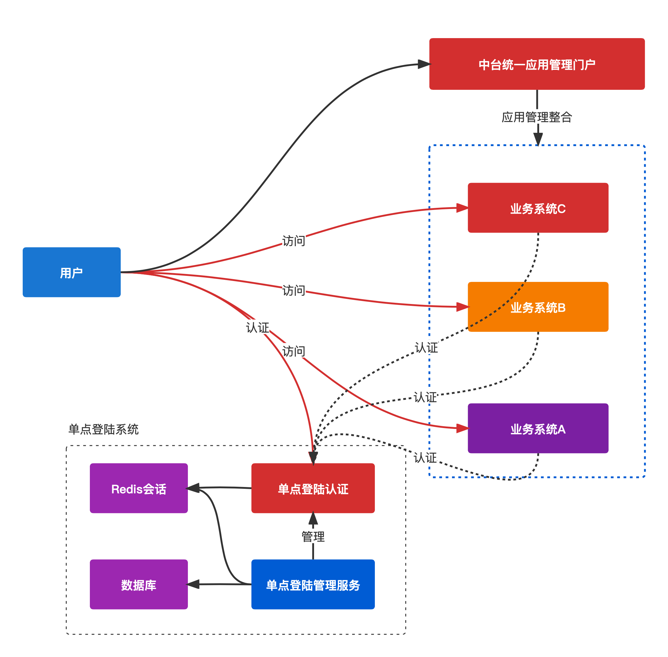 單點(diǎn)登陸解決方案架構(gòu),集成應(yīng)用管理門戶,集成多個(gè)業(yè)務(wù)系統(tǒng)管理,架構(gòu)如下: